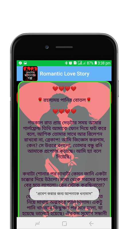 রোমান্টিক সব ভালোবাসার গল্প নিয়ে সাজানো আমাদের এই অ্যাপ্লিকেশনটি।আপনাদের জন্য বাছাইকৃত সব নতুন গল্প যোগ করেছি এই অ্যাপটিতে।আমাদের এই রোমান্টিক ভালোবাসার গল্পের ঝুড়ি অ্যাপটিতে অআপনি পাবেন রোমান্টিক সব ভালোবাসার ছোট গল্প এবং পর্ব ভিত্তিক গল্পগুলো প্রতিনিয়ত।ভালোবাসার এই গল্পের অ্যাপটির বিশেষ সুবিধা হলো , আপনার ভালো লাগা গল্পটি আপনার পছন্দের মানুষকে শেয়ার ও ম্যাসেজ করতে পারবেন আমাদের অ্যাপের মাধ্যমেই।