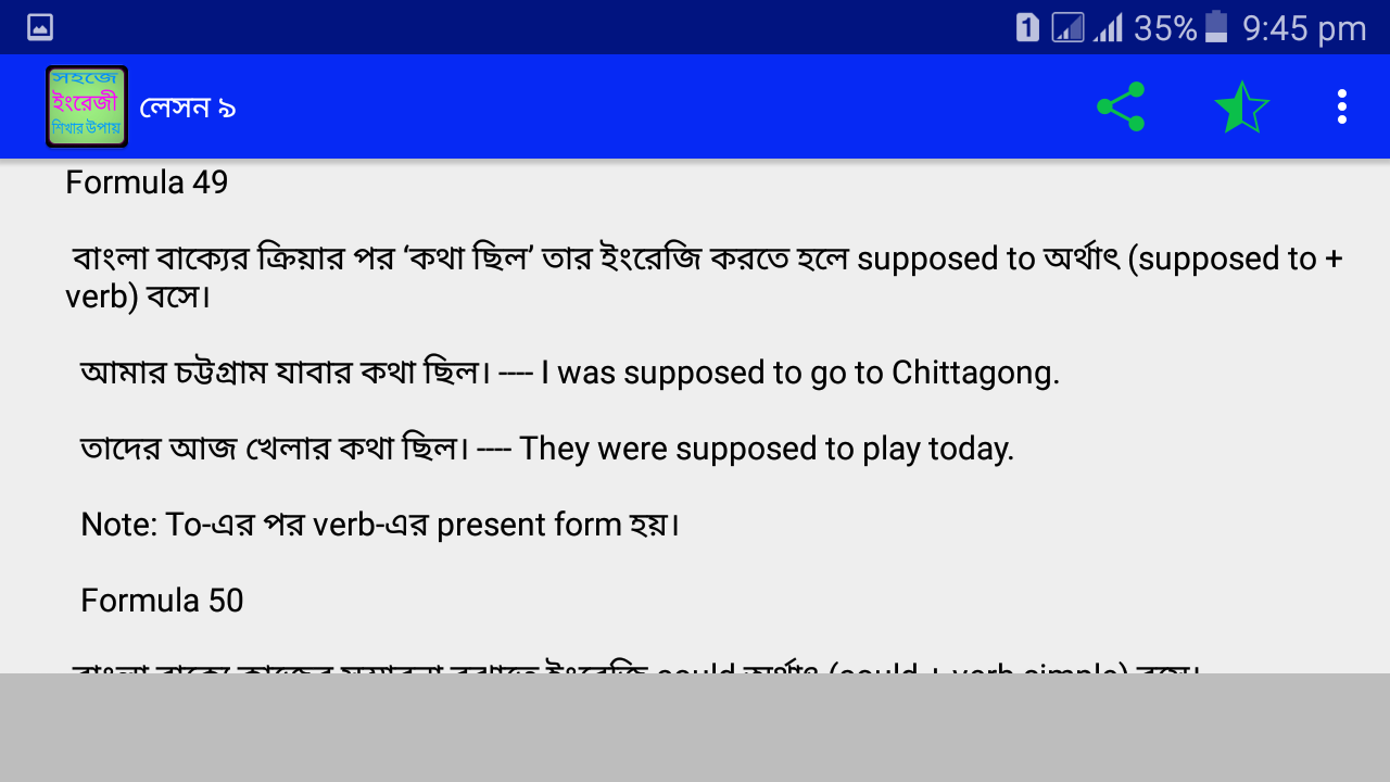আমাদের এই স্পোকেন ইংলিশ অ্যাপস টি আপনার দৈনিন্দন জীবনে ইংরেজি শেখার সহজ উপায় উপায় গুলো নিয়ে আলোচনা করা হয়েছে. এটি মুলোত ইংরেজী শেখার কোর্স বা ইংরেজি শেখার বই, যেখানে বাংলা থেকে ইংরেজি ফর্মুলা এর মাধ্যমে ইংরেজি শেখার সহজ উপায় বলে দেয়া হয়েছে. ইংরেজি থেকে বাংলা অনুবাদ ও আপনি এই বাংলা অ্যাপস টিতে পাবেন. এই আপ্পস টি ব্যবহারের জন্য আপনি বাংলা টু ইংলিশ ডিকশনারী অথবা ইংলিশ টু বাংলা ডিকশনারী সাথে রাখতে পারেন. ফলে আপনার ইংরেজি শব্দ বাংলা উচ্চারন টি জেনে নিতে সুবিধা হবে. প্রচুর ইংরেজি ভোকাবুলারি জ্ঞান বাড়াতে হবে সাথে ইংলিশ গ্রামার চর্চাও করতে হবে. সঠিক ভাবে ইংরেজী শিক্ষা গ্রহনের জন্য নিয়মিত ইংরেজি গ্রামার বা ইংলিশ গ্রামার, ইংরেজি ভোকাবুলারি, ইংলিশ স্পোকেন ভালোভাবে চর্চা করতে হবে. 30 দিনে ইংরেজি শিখুন, 15 দিনে ইংরেজি শিখুন অথবা 30 দিনে ইংরেজি গ্রামার শিখুন ইত্যাদি আপ্পস বাজারে বহুল প্রচলিত. তবে সত্যিকার অর্থে 30 দিন বা 15 দিনে আপনি দিনে কোন জিনিসে দক্ষ হতে পারবেন না, প্রতিনিয়ত অধ্যবসায়ের মাধ্যমে আপনি ইংরেজী শিক্ষায় দক্ষ হয়ে উঠতে পারেন.