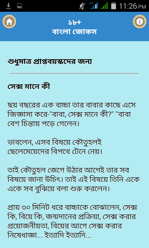 জীবনকে সুন্দর ও উপভোগ্য করার জন্য হাসি এবং বিনোদনের কোন বিকল্প নাই। আমাদের এই চমৎকার অ্যাপ এ সেরা সকল ১৮+ মজার এবং হাসির জোকস নিয়ে এসেছি যা আপনার খারাপ মনকে উৎফুল্ল করে তুলবে। আমাদের সকল গরম এবং মজার জোকসগুলো বিশেষভাবে আপনাদের জন্য নির্বাচিত করা হয়েছে আশা করি আপনাদের ভাল লাগবে আর ভাল লাগলে আমাদেরকে কমেন্ট এর মাধ্যমে জানাবেন আমরা আরও নতুন নতুন জোকস নিয়ে হাজির হব।