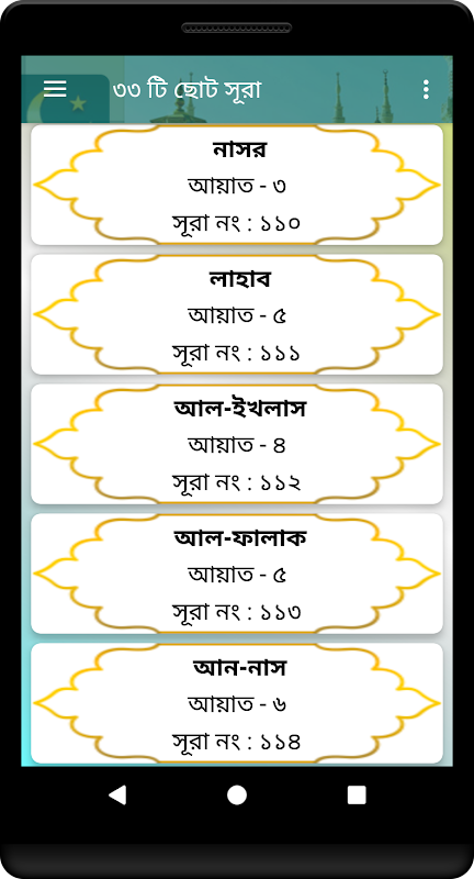 HD Quality Audio MP3 সহ আরও যা যা থাকছে এই অ্যাপ টিতে, ৩৩ টি ছোট সুরা আরবী, বাংলা উচ্চারণ, বাংলা আর্থ, যাতে খুব সহজেই সূরাগুলি শুনতে, পড়তে ও বুঝতে পারাযায়, যারা এখনো নামাজ পড়ার জন্য সূরা শিখেননি, এই App থেকে খুবসহজেই শিখতে পারেন অথবা আপনার ঘরে যদি কোন ছোট বাচ্চা থাকে তাদেরকেও শিখাতেপারেন। In this App most useful and easy 33 small surah with benglai pronunciation, meaning and audio MP3 file for listen all surah clearly. This app for memorize all small surah easily. এই অ্যাপ টিতে আরও থাকছে, সূরা আল ফাতিহা, সূরা ফীল, সূরা কোরাইশ, সূরা মাউন, সূরা কাওসার, সূরা কাফিরুন, সূরা নছর, সূরা লাহাব, সূরা এখলাছ, সূরা ফালাক,সূরা নাস, ছোট সূরা বাংলা, Surah Al-Fatihah, Surah Al-Tatfif, Surah Al-Insyiqaq, Surah Al-Buruj, Surah At-Tariq, Surah Al-A'la, Surah Al-Gasyiyah, Surah Al-Fajr, Surah Al-Balad, Surah Asy-Syamsa, Surah Al-Lail, Surah Ad-Duha, Surah Al-Insyirah, Surah At-Tin, Surah Al-'Alaq, Surah Al-Qadr, Surah Al-Bayyinah, Surah Az-Zalzalah, Surah Al-'Adiyat, Surah Al-Qari'ah, Surah At-Takasur, Surah Al-'Asr, Surah Al-Humazah, Surah Al-Fil, Surah Quraisy, Surah Al-Ma'un, Surah Al-Kausar, Surah Al-Kafirun, Surah An-Nasr, Surah Al-Lahab, Surah Al-Ikhlas, Surah Al-Falaq, Surah An-Nas, 33 small surah from Al Quran, Islamic app, namaz shikkha, ধন্যবাদ, Thanks.