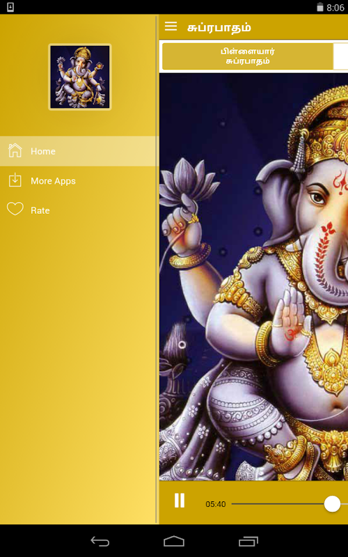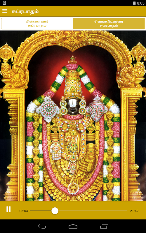 This app contains both Pillaiyar and Venkateshwara suprabhatam songs in tamil.