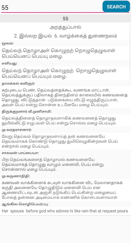 Sie können Kural mit Kural Nummer, Iyal, Athikaaram oder einem beliebigen Wort suchen.