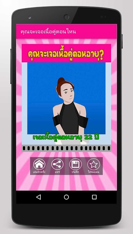 แอปฯคุณจะเจอเนื้อคู่ตอนไหน มาทำนายกันเล่นๆ ว่าชาตินี้คุณจะได้เจอเนื้อคู่ตอนอายุเท่าไร จะเป็นโสดอีกนานแค่ไหน เมื่อได้รับผลการทำนายแล้ว แอปฯยังสามารถแชร์ให้คนรู้จัก หรือเพื่อนๆคุณรู้ได้ ผ่านทาง Line Facebook หรือ Social Network อื่นได้ หวังว่าแอปฯนี้จะสร้างความประทับใจให้กับคุณได้ไม่มากก็น้อย
