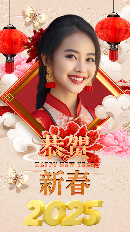 Frohes chinesisches Neujahr 2025. Chinesisches Neujahrsfest mit der Bewerbung Mit der Fotobearbeitung zum Chinesischen Neujahr 2025 können Sie wunderschöne Fotos zum Chinesischen Neujahr zusammenstellen, um sie Ihren Lieben während des chinesischen Neujahrsfestes zu wünschen. die mit Bildern zum chinesischen Neujahr 2025 mit schönen Aufklebern dekoriert werden können Fotobearbeitung zum chinesischen Neujahr Wählen Sie aus vielen Dekorationen wie roten, silbernen, goldenen Laternen und niedlichen Ang Pao-Taschen und verleihen Sie Ihrem Schmuck noch mehr Schönheit. Fotorahmen zum Chinesischen Neujahr 2025 mit geschriebenen chinesischen Neujahrsgrüßen, um wohlhabend, wohlhabend, wohlhabend und glücklich zu sein, gesendet als chinesische Neujahrsgrußkarte. Versenden Sie Ihr Glück auf moderne Art und Weise durch die Online-Welt. Ich wünsche Ihnen ein frohes chinesisches Neujahr 2025.