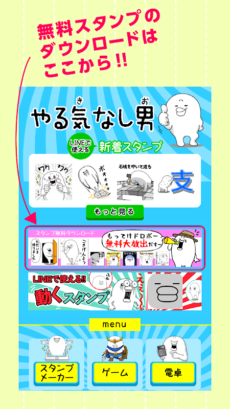 有料登録(※任意)すると、5,000個以上の通常スタンプの他、大人気の動くスタンプなど、やる気なし男スタンプが取り放題~毎日新作スタンプを続々公開中♪
