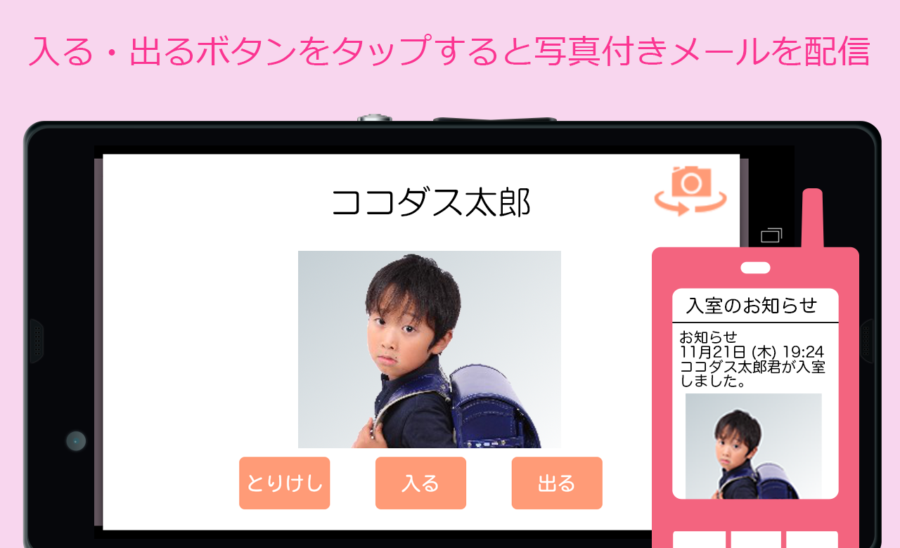 保護者様に安心感を与える為、生徒の選択時に顔写真を撮影してメールに添付することができます。