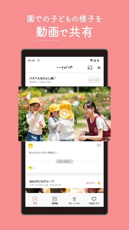 Lehrer können ganz einfach Videos posten, indem sie einfach ein mit einem Smartphone oder Tablet aufgenommenes Video auswählen und Kommentare eingeben. Eltern erhalten Push-Benachrichtigungen über neue Videos, verpassen Sie also nicht das Wachstum Ihres Kindes! Einfache Funktionen und Bedienbarkeit, kein Handbuch erforderlich.