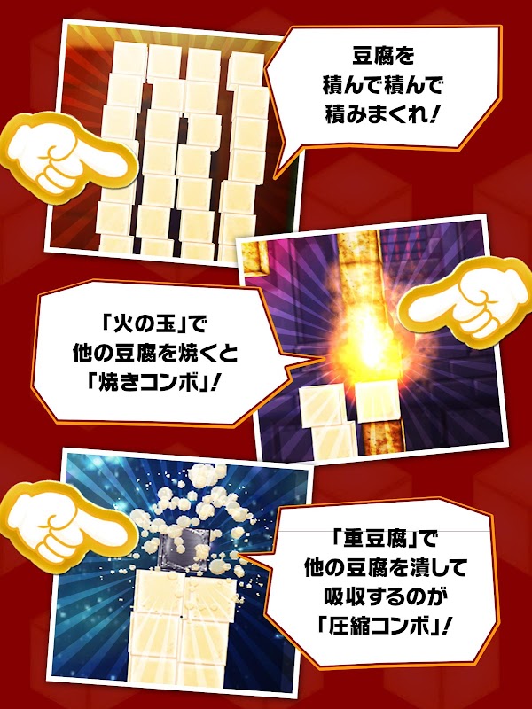広告・課金一切なし! オフラインでプレイ可能!! 世界初!?豆腐積みパズルアクションゲーム「とうふつみ」登場! 積んで、焼いて、圧縮して、目指せ高得点!