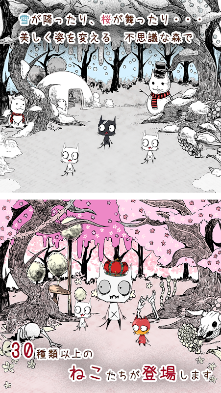 森の種類によって、現れるねこも変わります。40種類以上のねこと出会って図鑑コンプリート&使命を果たしましょう!