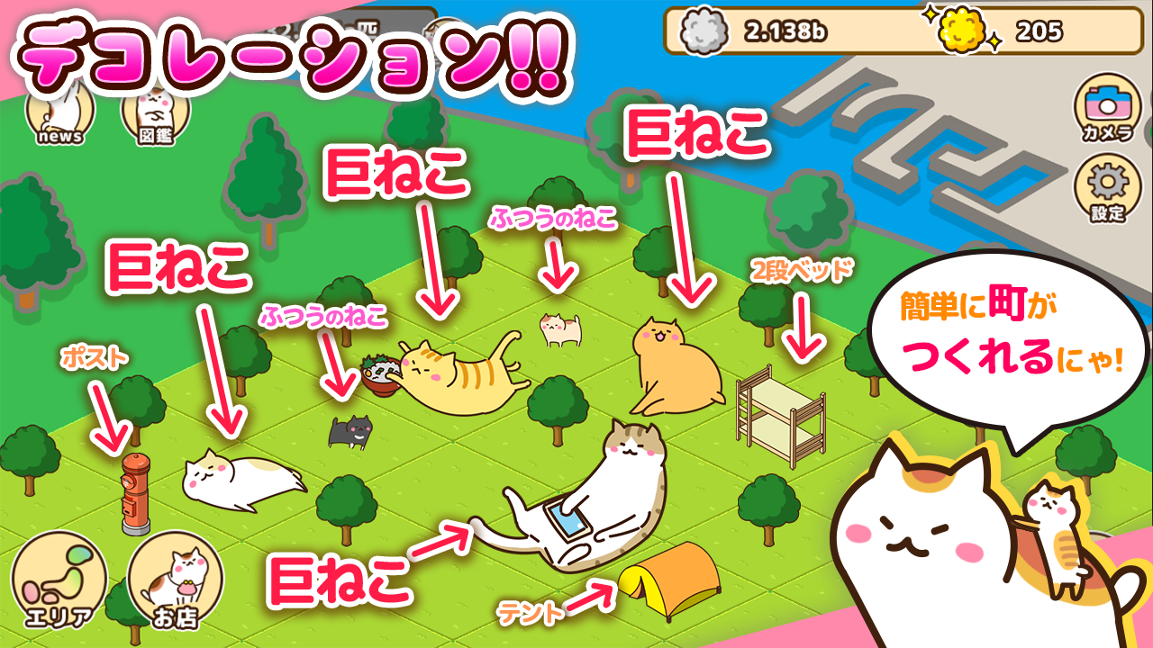 巨ねこさんを町に配置して、強化して、たくさんのねこさんを呼び込みましょう!