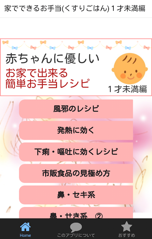 赤ちゃんが泣き止むおうちで出来るお手当レシピの無料アプリです。このアプリで遊びならが赤ちゃんもおいしくて大好きなおくすりれレシピを楽しく作ってみてください。