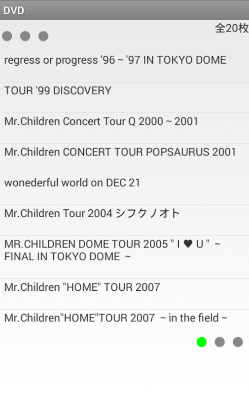 アルバム、DVD収録情報も一覧可能で、コメントをつけてFacebookに投稿したり
