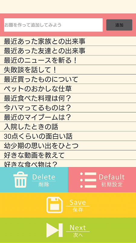 デフォルトに用意されているお題150問の他に自身で考えたお題も追加することができます。また、場に合わないお題も削除することができます。