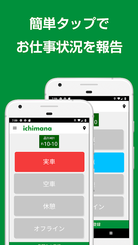 画面上の「実車」「空車」「休憩」を切り替え、現在位置と一緒にお仕事状況を自動で取引先企業に報告することで仕事をスムーズに。