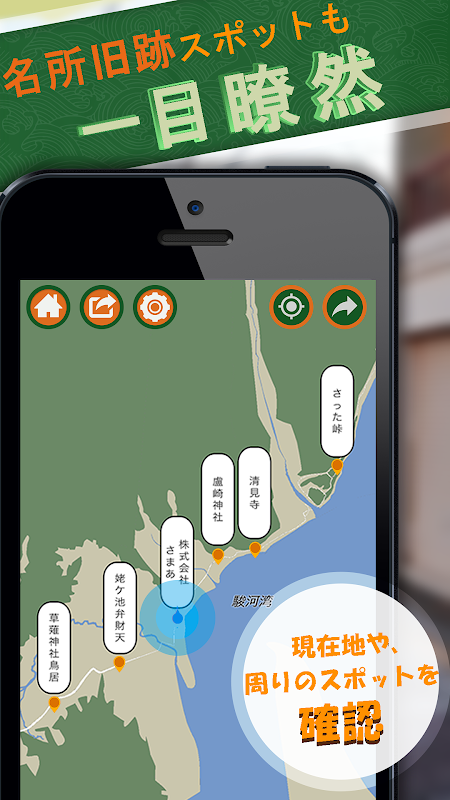 静岡市内を通る旧東海道にお手持ちのスマートフォンをかざすだけで、その場所の江戸時代の風景が画面に映し出される観光向けのエンターテイメントアプリです。