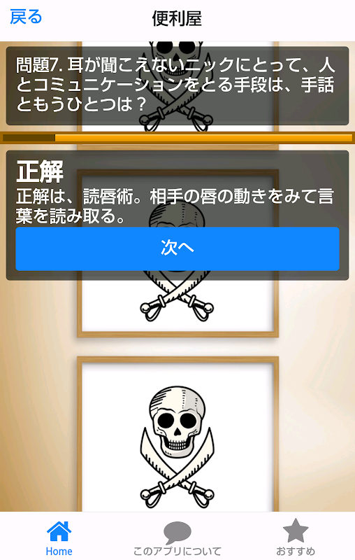 クイズは、全36問からで、キャラクター名のフルネームあてクイズ、択一、○×選択、複数選択クイズなどをランダムに配置してあります。