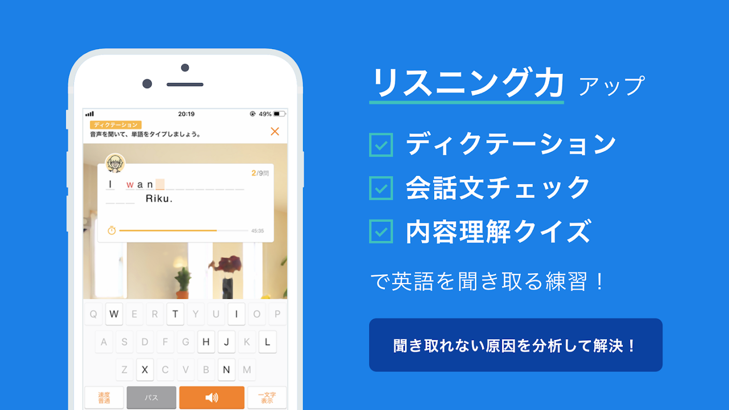 Wir bieten eine umfassende Palette an Funktionen, darunter Online-Englischkurse, die von Japans besten Englischlehrern unterrichtet werden, eine Konversationssimulationsfunktion mit Zeichen und ein Hörtraining, das die Ursachen der Verständlichkeit automatisch erkennt und behebt.