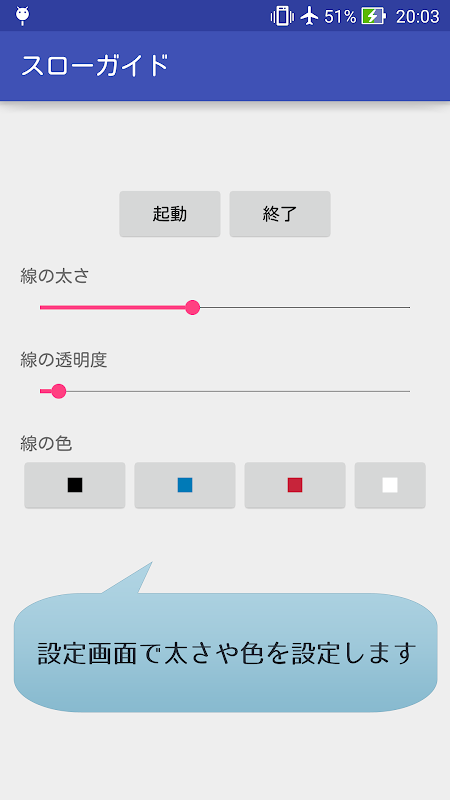 1.アプリを起動し、線の色・太さ・透明度をお好みに設定します