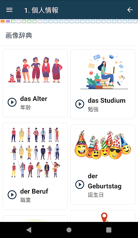 Entdecken Sie Deutsch auf ganz neue Weise mit unserem Themenwörterbuch. Deutscher Wortschatz Teil 1 ist das perfekte Werkzeug zum Erlernen des deutschen Wortschatzes, mit Bildern, Wiederholungssystem und interaktiven Übungen! Machen Sie das Lernen mit unserer App ansprechender und effektiver. Mit unserer Anwendung können Sie schnell und intuitiv den Wortschatz erlernen, den Sie für die alltägliche Kommunikation benötigen. App-Funktionen: Thematische Kategorien mit Bildern: Lernen Sie anhand von Kategorien wie Reisen, Essen, Arbeit usw. mit visueller Unterstützung, um das Auswendiglernen zu fördern. Wiederholungssystem: Optimieren Sie Ihr Lernen mit einem intelligenten Wiederholungssystem, das sich automatisch an Ihren individuellen Fortschritt anpasst. Interaktive Übungen: Üben Sie Ihren neu erworbenen Wortschatz und machen Sie das Lernen durch eine Vielzahl interaktiver Übungen zum Spaß. Audio-Aussprache: Lernen Sie die korrekte Aussprache mit Audioaufnahmen. Direktes Lernen: Offline-Lernen jederzeit und überall verfügbar. Grundwortschatz: Das Wörterbuch enthält über 1200 deutsche Wörter und Sätze, in denen sie verwendet werden. Deutscher Wortschatz Teil 1 wurde für moderne Lernende entwickelt, die traditionelle Lernmethoden mit interaktiven und visuellen Werkzeugen kombinieren möchten. Unabhängig von Ihrem Niveau finden Sie hier Tools, die Ihnen helfen, effektiv Deutsch zu lernen. Laden Sie die App herunter und beginnen Sie noch heute Ihre Deutschlandreise.