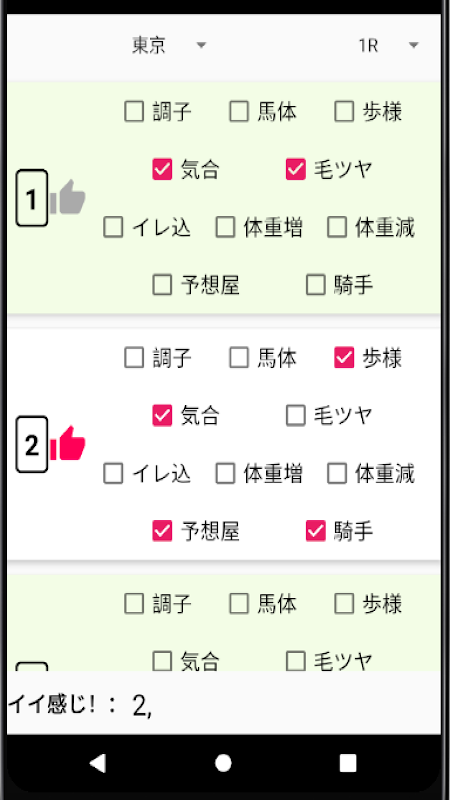 Es gibt eine Checkliste mit Ton, Geist, Eile, Jockey usw., und Benutzer können leicht Paddock-Informationen aufschreiben, indem sie auf sie tippen und "Gefällt mir" für Pferde überprüfen, die sie mögen.