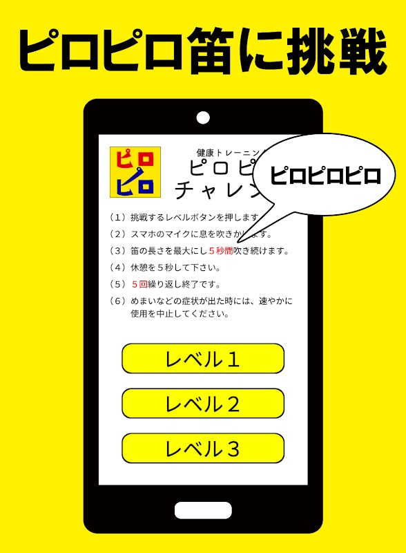 "Piro Piro Challenge" ist eine kostenlose Android-App, mit der Sie problemlos Atemtraining und Mundfunktionstraining durchführen können. Dieser Name wird vergeben, weil das Motiv "Piro Piro Flöte" ist. Warum "Piro Piro Whistle" für Atemtraining und Mundfunktionstraining? Viele Leute mögen sich fragen. Kürzlich wurde jedoch festgestellt, dass diese Pfeife für Diäten und Rehabilitation wirksam ist und im Bereich der Langzeitpflege eingesetzt wird.