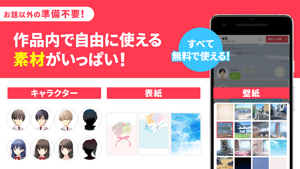 Eine Roman-Posting-App, mit der Sie so viel lesen können, wie Sie möchten, von herzzerreißenden Liebesromanen bis hin zu Traumromanen, Wahnvorstellungen und Horrorromanen. Eine App zum Erstellen von Romanen, mit der Sie in einem Chat-Format wie LINE lesen und auch Originalromane schreiben können.