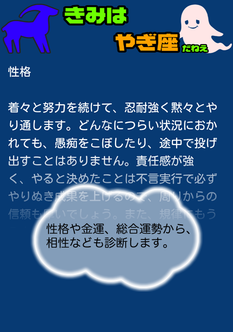 「ホントに当たるから怖い!誕生日診断」はあなたの生年月日、血液型、性別からあなたと同タイプの芸能人名、性格、総合的な運勢、恋愛運、結婚運、金運、相性ランキング(芸能人)、相性ランキング(1~48位程まで)、と一度に様々な診断が楽しめます。