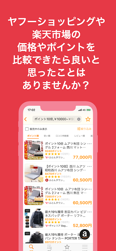 楽天市場、Yahoo!ショッピング、Amazonからの商品を検索してポイント順に並べて表示します。選択していただければ、該当のサイトでお買い物もできます。また、価格順に並び替えもできます。