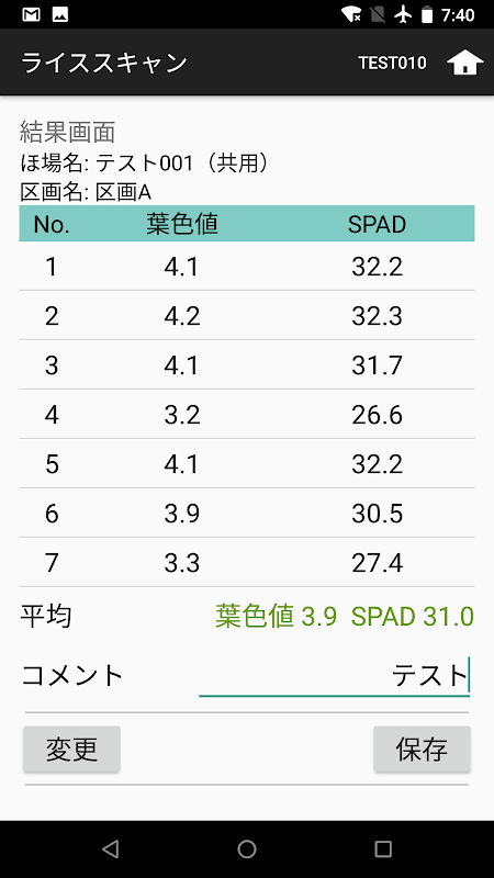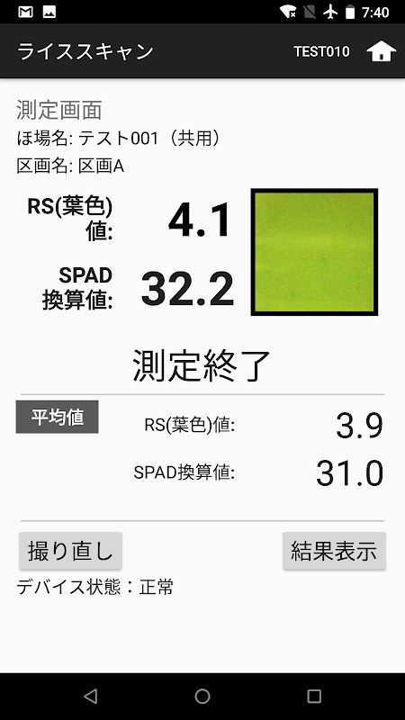 2. 測定データと一緒に利用者情報、測定日時および ほ場詳細(ほ場名、区画名、GPS情報)が自動登録・保存されるので手入力が不要です。
