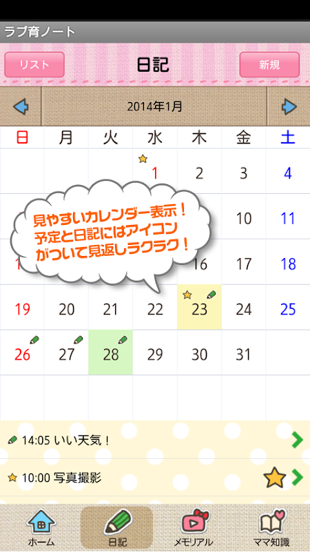日記メニューに行き右上の「新規」ボタンから予定または日記を選んで内容を登録!