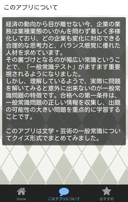 このアプリは就活と公務員試験受験を控える学生向けに2017年度に出題が予想される一般常識の文学・芸術のスキルアップに向けた無料学習アプリです。