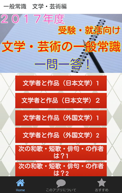 このアプリは就活と公務員試験向けの文学・芸術の一般常識を問題集にした無料学習アプリです。疎かにしがちな文学・芸術問題をおさえて、ライバルに差をつけろ!!!
