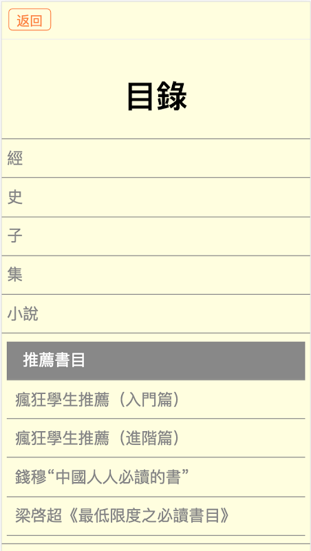本應用是一個中國古代書籍的圖書庫,務求收集盡可能多的中國古典書籍。帶有字體縮放、書籤、評論、字典和聽書功能(支持國語和粵語)。目前收錄古籍約12億字(《四庫全書》約8億字),以經史子集小說分類,包括四書五經、大藏經、道藏、四大名著等。