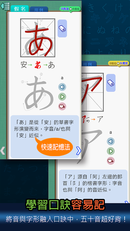 Wählen Sie die richtige Methode und die Kana-Silben können leicht erlernt werden! Mit den auswendig lernenden Formeln und Assoziationen von Quelle, Form und Klang des Wortes mit der Schreibfunktion können sich Anfänger leicht 50 Klänge merken!