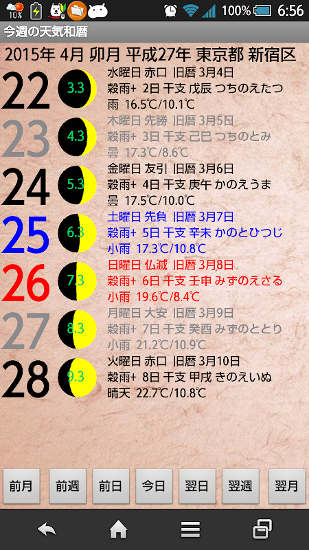 お好きな場所で 今週の天気和暦の情報をお楽しみください。