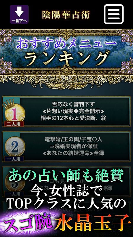 あの有名占い師が絶賛。女性誌オファー独占、メディア公認の的中力を誇る『水晶玉子』。絶大なる人気を誇る彼女の鑑定をあなたのお手元でご堪能下さい。