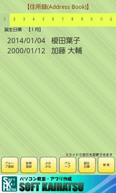 指スライドで、1月から12月まで日付順で氏名の一覧表を表示します。