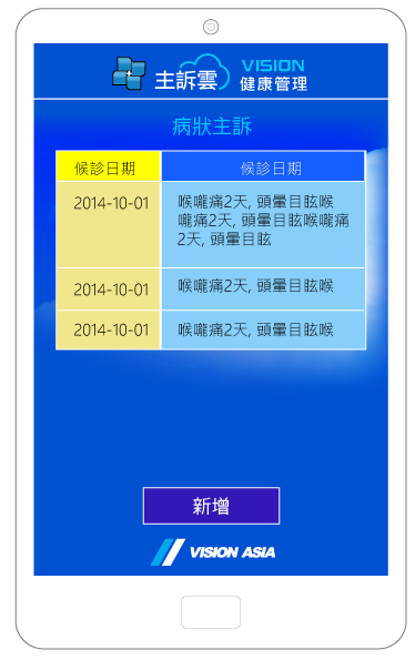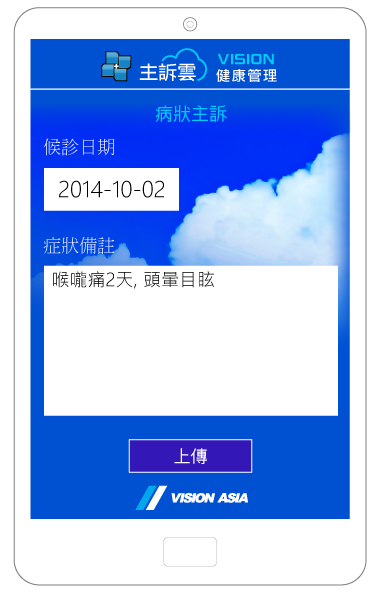 藉由雲端化服務,結合血壓自動量測設備,及自行輸入手機、平版個人病症自訴,透過雲端傳送至診所病歷系統,縮短醫師鍵入病歷資料時間,增加醫師與病患之互動。