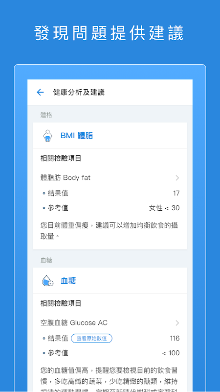 開啟「健康指南」功能,幫助你分析上傳的健檢報告數值,找出需要改善的健康問題,並提供參考值與建議,增加基礎知識外也能協助維持健康。