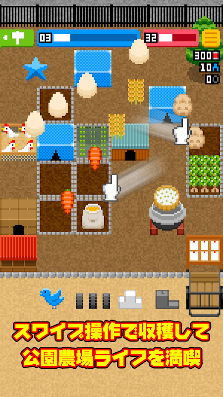 公園の空き地に家を建て、畑を耕し、食材や調理品を販売をする農場ゲームです。