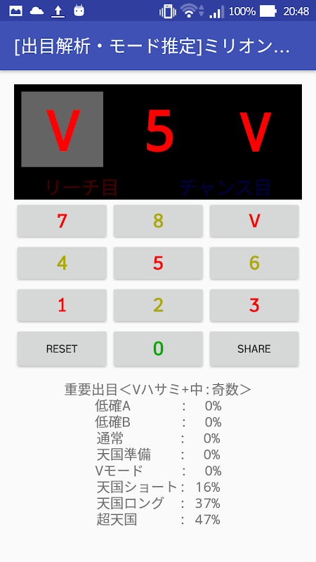 スロット「ミリオンゴッド-神々の凱旋-」のリーチ目、チャンス目、滞在モード推定アプリです。出目をタッチで入力するだけの簡単操作。