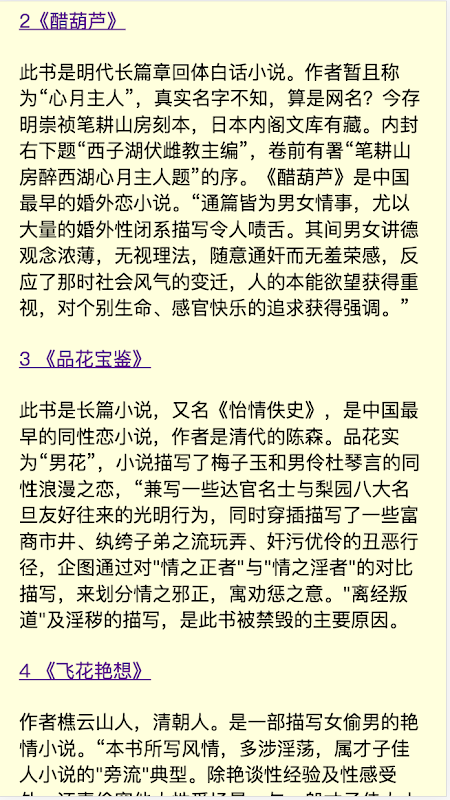 本应用收集七本古代的禁书:剪灯新话、醋葫芦、品花宝鉴、飞花艳想、九尾龟、肉蒲团、金瓶梅。古代禁书,呈现了当时各具异彩的文学景观。随着社会的开放,这些书籍在现代已经不再遭禁。但还是要提醒一下,少儿不宜读,成人亦适度。