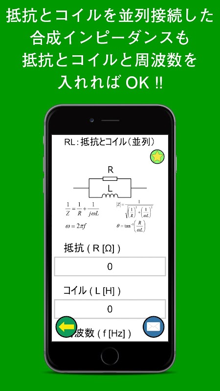 「回路計算機」はオームの法則、合成抵抗・容量、合成インピーダンスなどの計算を行う計算機です。普通の電卓としての機能はありません。簡単にオームの法則や合成抵抗などを計算することができます。わざわざ公式に値を入れながら計算するのが面倒、なんてときに便利な計算機です。アプリ内では可能な限り、公式も載せています。