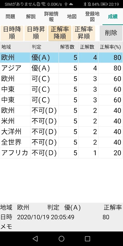 Wenn Sie bis zum Ende antworten, wird das Bewertungsergebnis angezeigt. In der Reihenfolge der besten Note wird es ausgezeichnet, ausgezeichnet, gut, akzeptabel und inakzeptabel sein und in der Datenbank registriert. Wenn Sie nach der richtigen Antwortrate sortieren, können Sie die Bereiche sehen, in denen Sie nicht gut sind.
