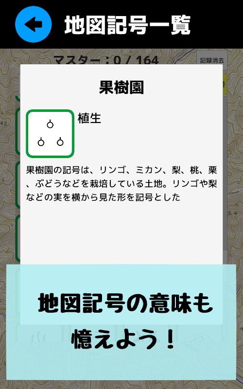 地図記号の一覧とタップして説明を見れるよ。