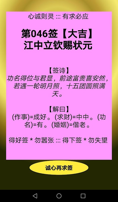 如果你遇事却无法到祠庙里求签,必然心急如焚。请下载这款手机应用程式随身备用,即可随时随地求签,趋吉避凶。只要心诚则灵,有求必应。有了这款手机应用程式备用,万一有事发生,可立刻求签。平时无事则不妨多行善积德。