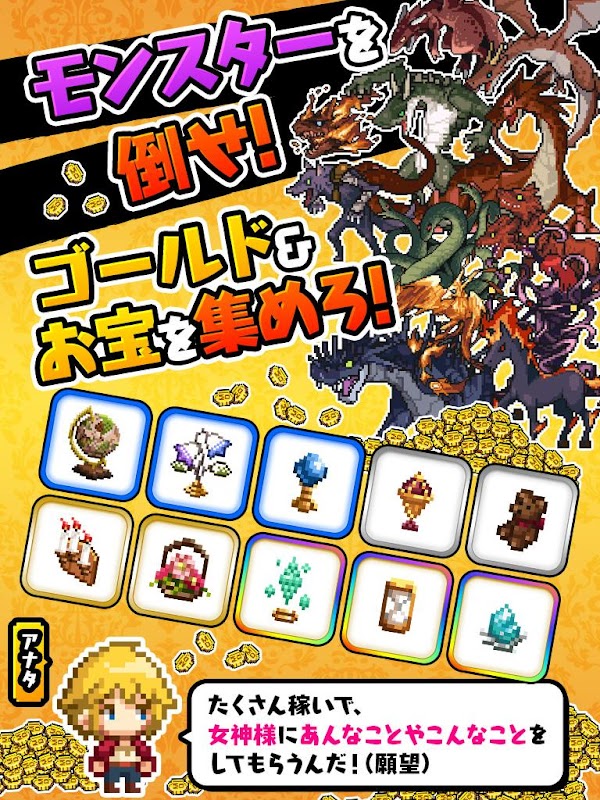 【美しい女神のために、モンスターを倒して、稼ぎまくれ!】 タップで簡単操作!武器、スキル、仲間でどんどん強くなる! 無料で遊べる、爽快タップバトルRPG!!