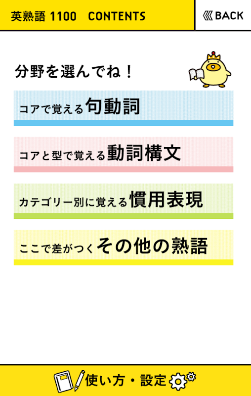 全国の大学入試データや各種英語資格試験を徹底分析した『大学入試ランク順 入試英熟語1100』の中から抜粋してクイズを作成。本と同じように,「句動詞」「動詞構文」「慣用表現」「その他の熟語」の分野ごとに分かれているので,目的に合わせて学習を進められます。