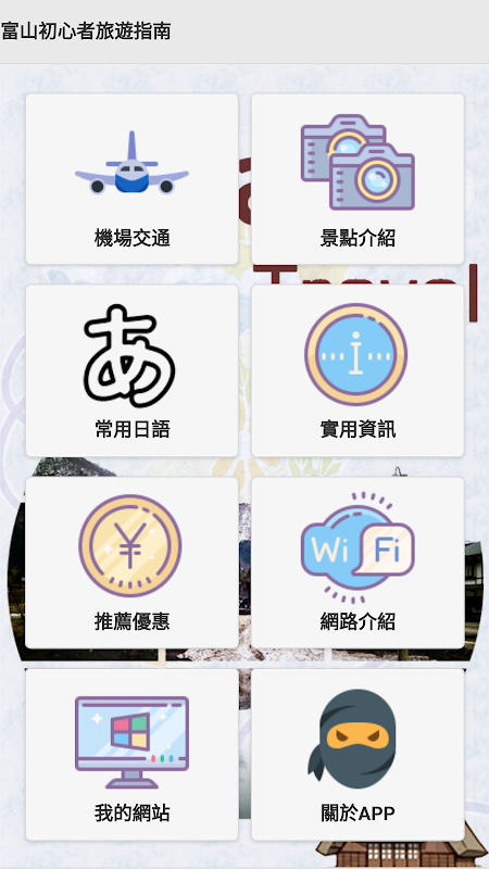 這是富山初心者旅遊指南,提供富山、金澤景點交通介紹(景點介紹有GPS可以協助導覽)、常用日語(點擊發音播送)、實用資訊(裡面有匯率計算、熱門商品、常買藥物、路線查詢、天氣查詢等介紹)、推薦優惠與免費無線網路介紹。