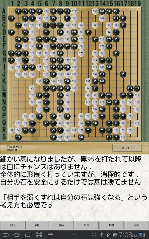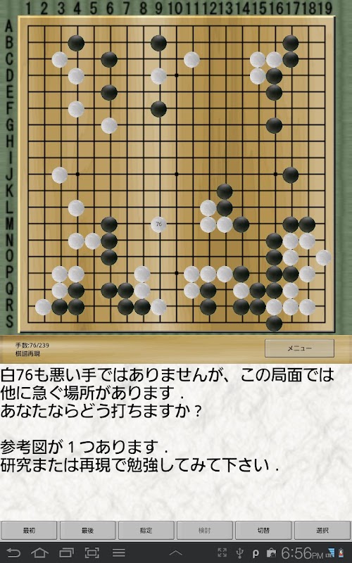 指導箇所には自分で手を打ち参考図と一致するか研究するモードがあります。より良い一手をめざして研究することができます。